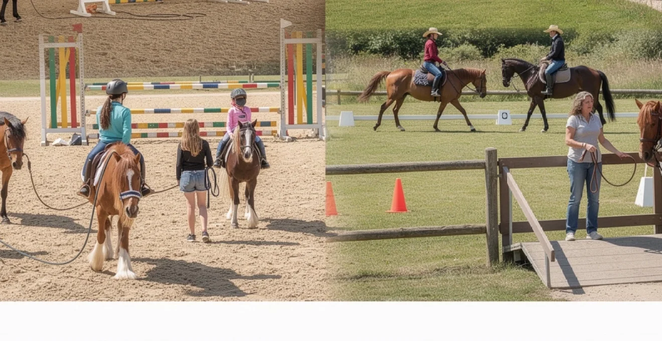 Les instructeurs utilisent des exercices spécifiques : variations d’assiette sur des barres au sol, travail sans étriers pour développer l’adhérence, exercices de coordination main-jambe. Cette progression méthodique permet d’atteindre un niveau galop 2 en moyenne après 20 à 30 heures de cours.